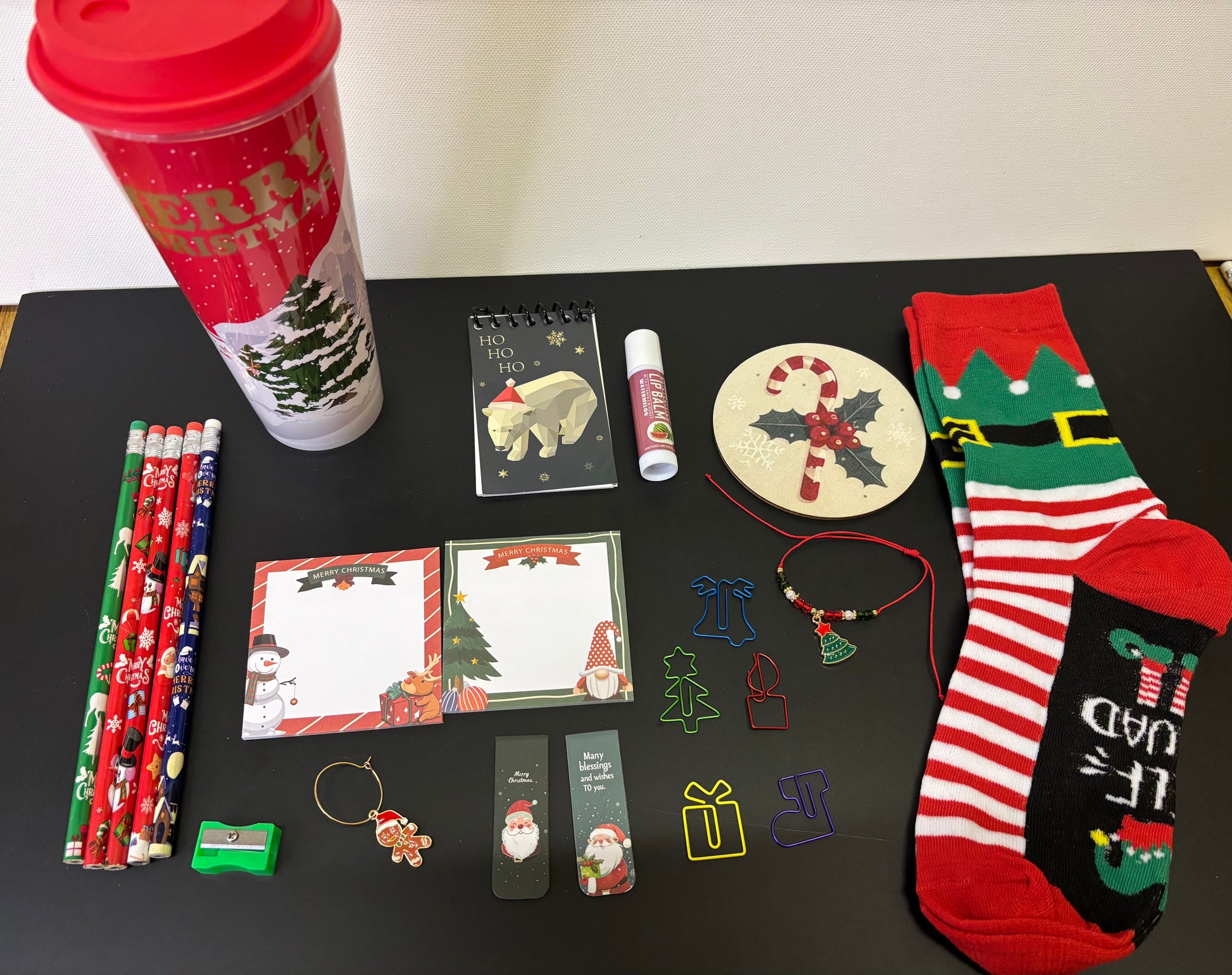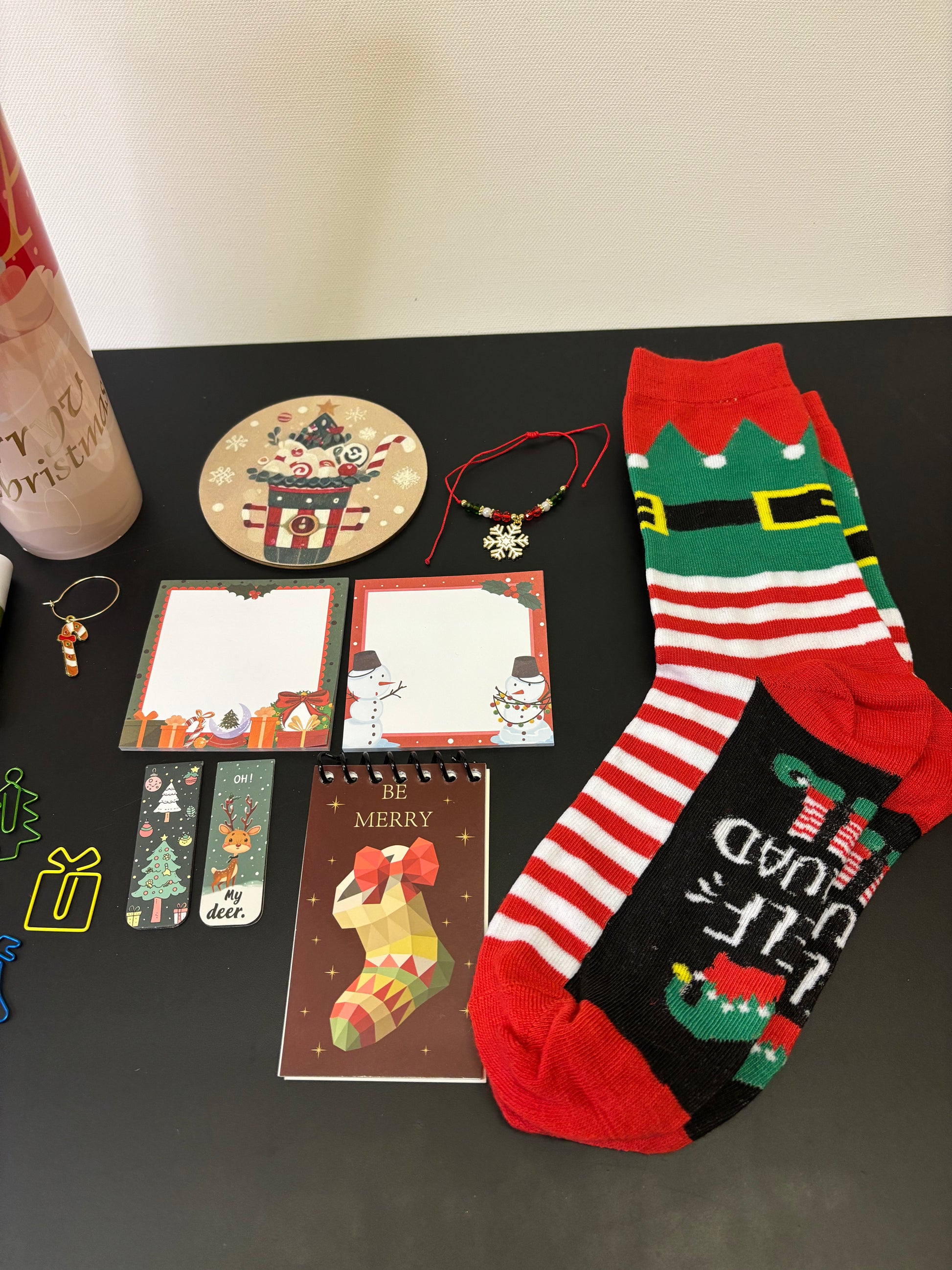 * Includes: Cup with lid, elf socks, mini notepad, sticky notes, charm bracelet, coaster, glass charm, pencils, Christmas paper clips, and bookmark.