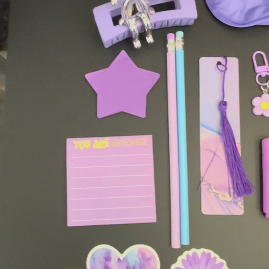 Purple and Blue Stationery Bundle - Includes Pens Clips Bookmarks Stickers Hair Clip & More Self Care Products