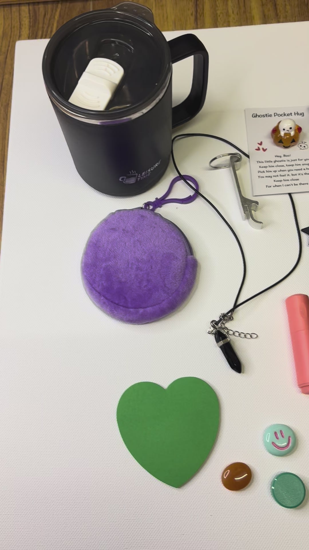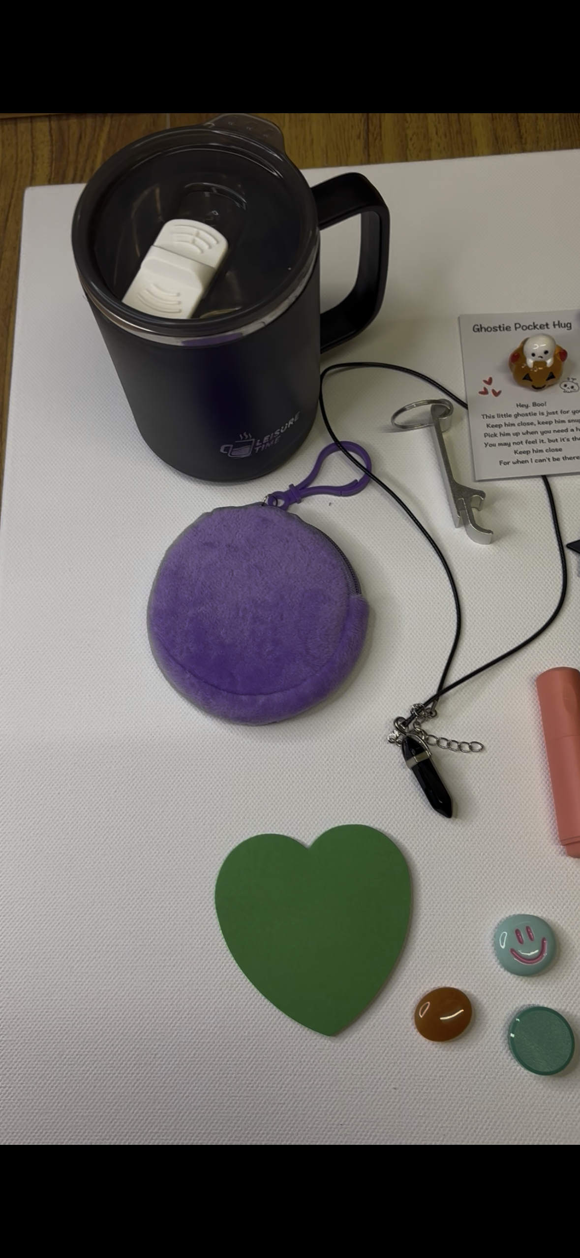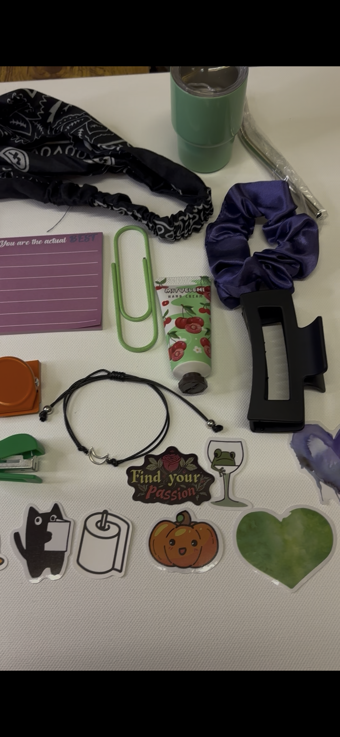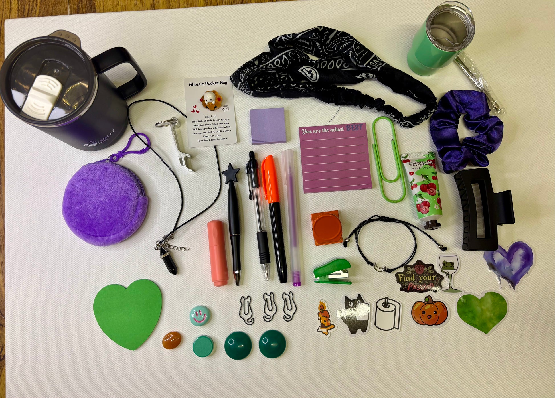 * Stationery: Lined sticky notes, heart-shaped sticky notes, mini tumbler, black insulated tumbler.